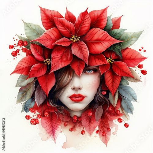 Red watercolour portrait of woman with poinsettia euphorbia pulcherrima star flower on head on white backdrop. Floral blossom art concept