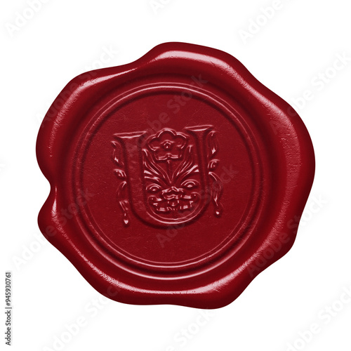Red wax seal with embossed letter U monogram initial isolated on transparent background