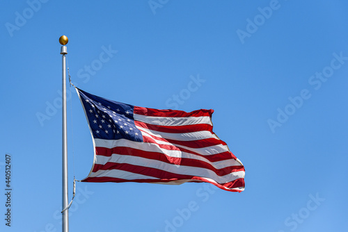 Red, white, and blue of an American flag flying in a breeze against a bright blue sky