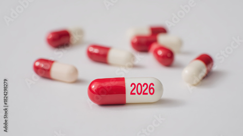 Red white pill capsule symbolizing future year medicine. health and healthcare concept for medical treatment and hopeful pharmaceutical science