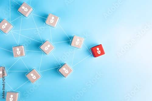 Red wooden block with businessman icon on blue background, Organisation structure, social network, Leadership, team building, recruitment business, management and human resources concepts. copy space