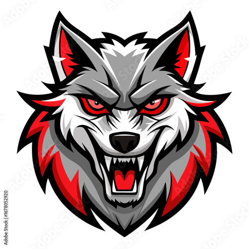 Red-Eyed Snarling Wolf Mascot in Sharp Vector Crest with Black-and-White Contrast