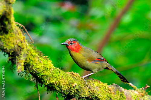 Red-face Liochichla perching on a mossy branch with details