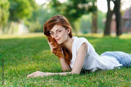 red-haired woman lying in the park on the grass