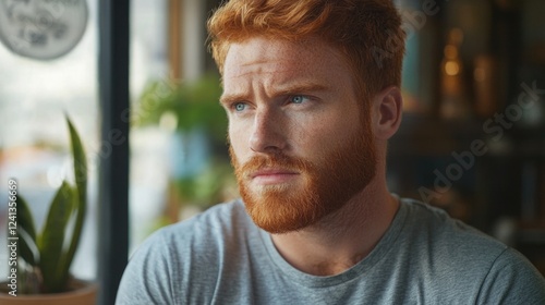 Redheaded man with well-groomed beard in gray t-shirt looking thoughtfully out of window in cozy café setting, contemplating future plans and goals
