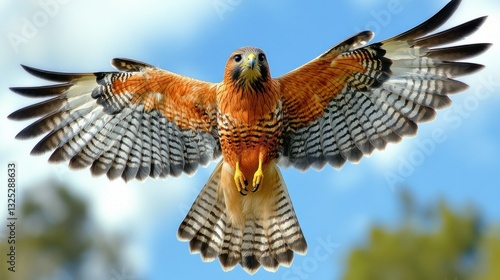 Red-shouldered hawk in flight against a blue sky