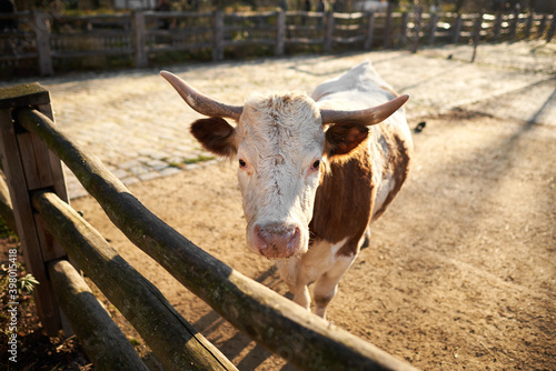 Red-spotted cattle is standing in a yard near the fence and staring at the camera