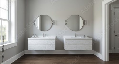 refined bathroom with double vanity sinks and minimalist circular mirrors