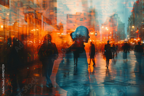 Reflection in the glass of the setting sun and silhouettes of people walking by on the background of high-rise buildings of a large city.