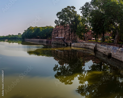 Reflections and serenity along the southern shore of Gajner lake in Rajasthan, India