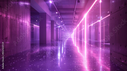 Reflective floor with purple laser beams creating a vibrant energy field