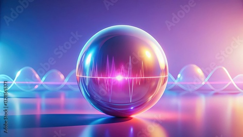 Reflective Sphere Displaying Vibrant Energy Waveforms on a Polished Surface with Glowing Abstract Lines