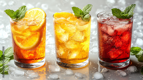 Refreshing assortment of colorful iced beverages with mint and citrus garnishes on ice