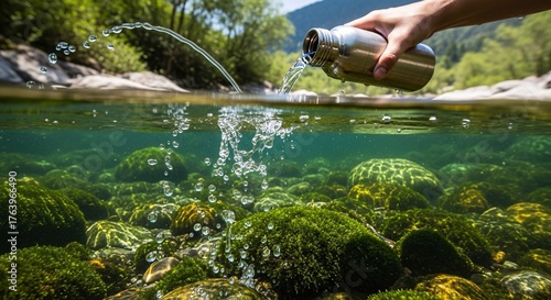 Refreshing clear water poured from metal bottle into vibrant green river