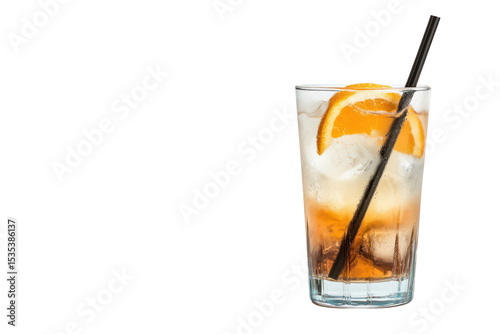 Refreshing Cocktail: a clear glass with an orange slice and straw, inviting you to savor the crisp flavors and vibrant refreshment