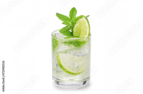 Refreshing cocktail with mint and lime on a white backdrop