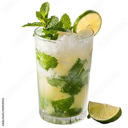 Refreshing cocktail with mint leaves and lime wedge in glass for summer party enjoyment