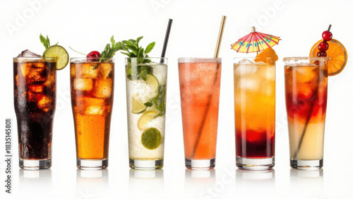 Refreshing cocktails with garnishes on a white background, perfect for summer