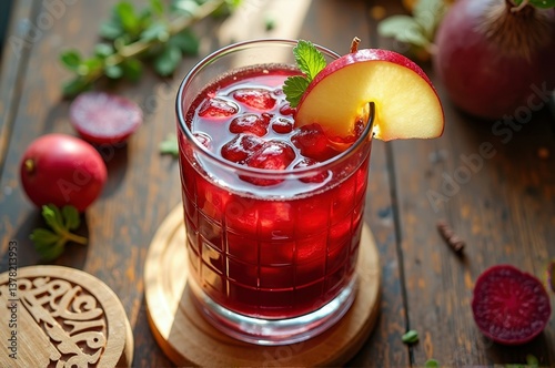Refreshing cranberry apple cocktail with ice and fresh garnish on rustic table