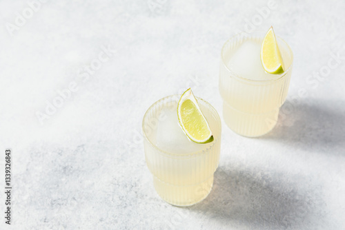 Refreshing detox citrus drink. Vitamin water with lime slices and ice cube on white table. Healthy, organic antioxidant drink. Summer lemonade, mocktail, nonalcoholic beverage concept.