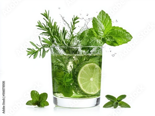Refreshing herbal drink with mint and lime, splashes water, white isolate background.