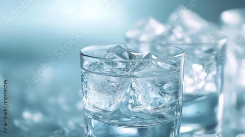 Refreshing Ice Water in Glass: A close-up view of a glass filled with ice cubes and water, capturing the purity and refreshment of a cool drink on a hot day. The ice cubes sparkle and glisten.