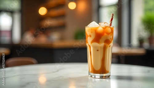 Refreshing Iced Caramel Latte in a Glass at a Cafe Table