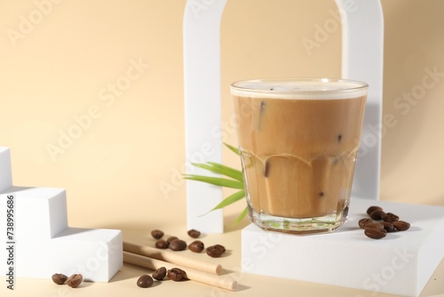 Refreshing iced coffee with milk in glass and beans on pale yellow background, space for text