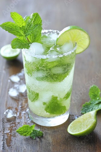 Refreshing lime and mint cocktail with ice on rustic wooden table