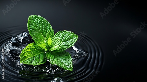 Refreshing mint leaves float on dark water, creating a serene and vibrant image.