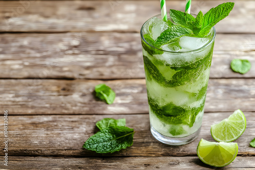 Refreshing mojito cocktail with fresh mint leaves, lime wedges, and crushed ice in a tall glass on a rustic table