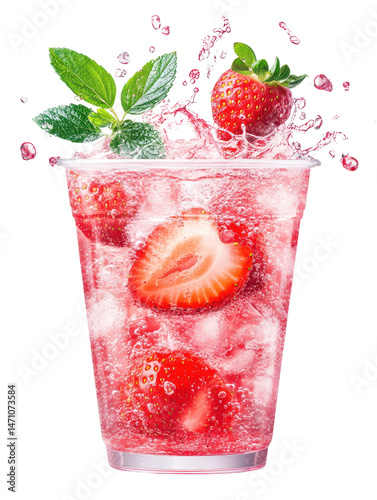 Refreshing Strawberry Splash: A close-up of a refreshing strawberry beverage, with juicy strawberries and fresh mint leaves splashing in a clear plastic cup filled with ice.