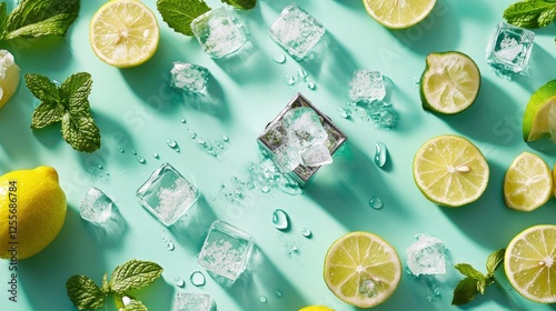 Refreshing summer limes, lemons, mint, ice flatlay