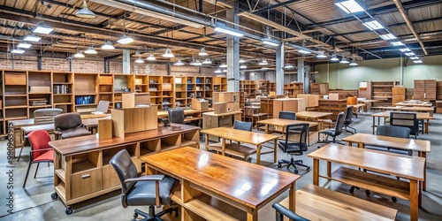 Refurbished wooden desks, chairs, and shelves stacked in a warehouse, offering affordable and sustainable second-hand