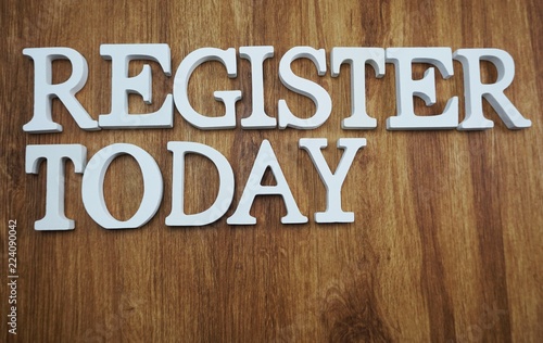 register today alphabet letters top view on wooden background
