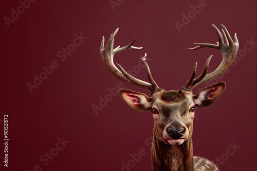 Reindeer with antlers on red background. Concept of Christmas and new year, winter holidays. Deer head on burgundy background.