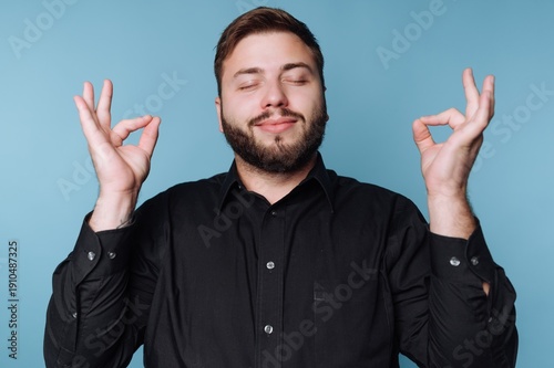 Relaxation and mindfulness captured in a calm atmosphere with a man practicing meditation against a serene blue backdrop