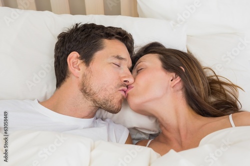 Relaxed couple kissing in bed