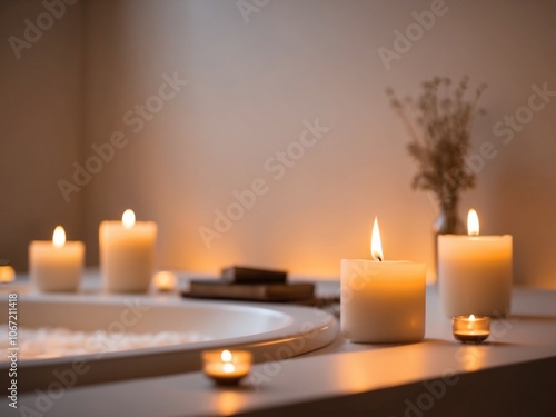Relaxing evening bath with lit candles in tranquil atmosphere.