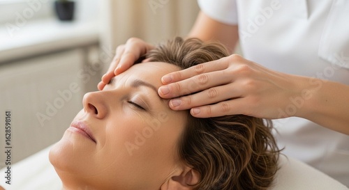 Relaxing facial massage performed by a therapist on a woman lying down.
