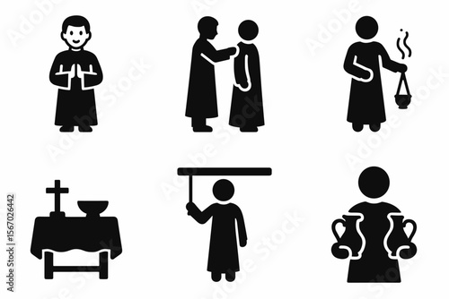 Religious symbols: monks, worship, rituals, altar, bell, vases vector icon isolated illustration