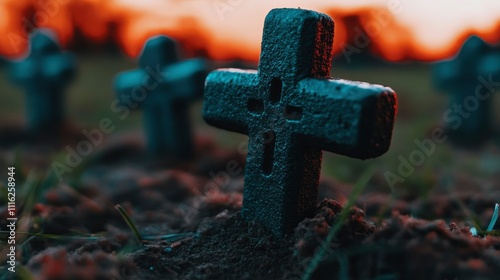 Remembrance Close-up of Crosses at Sunset in a Grave Yard