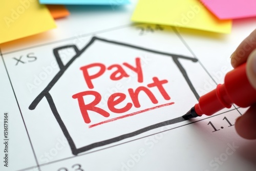 Reminder to Pay Rent: Paper Calendar with Bold Red Marker, Colorful Sticky Notes, and House Outline