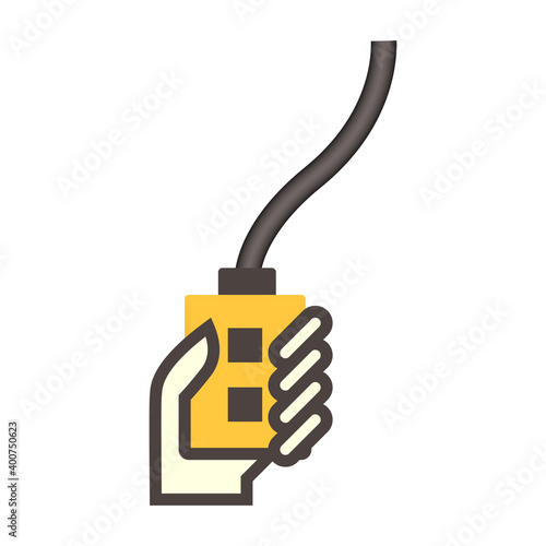 Remote control vector icon. Include hand of operator, button, cable. For control, operate, adjust industrial machine i.e. electric lifting hoist trolley of overhead crane, winch, roller shutter, door.