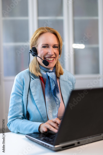 Remote work: woman using a laptop and headset for virtual meetings.