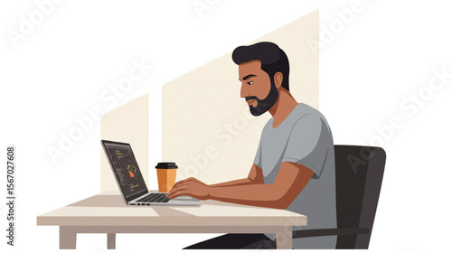 Remote worker graphic depicting a man typing on laptop, ideal for freelancer profile or online business concept projects.