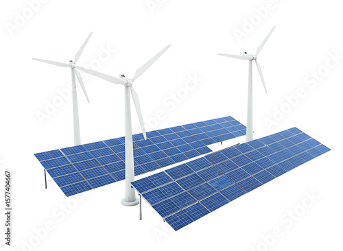 Renewable energy sources with solar panels and wind turbines isolated on transparent background