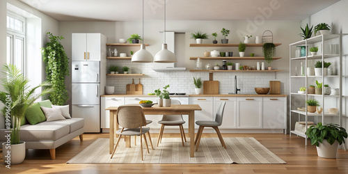 Rent of modern housing sale of new apartment modern renovation White furniture with utensils shelves with crockery and plants in pots refrigerator in simple minimal dining room empty s : Generative AI