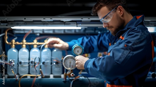 Repairman Checking AC Unit Refrigerant Pressure with Gauges for Optimal Maintenance and Performance