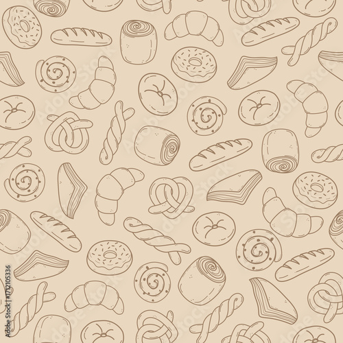 Repeat pattern of hand drawn bakery goods on brown color background